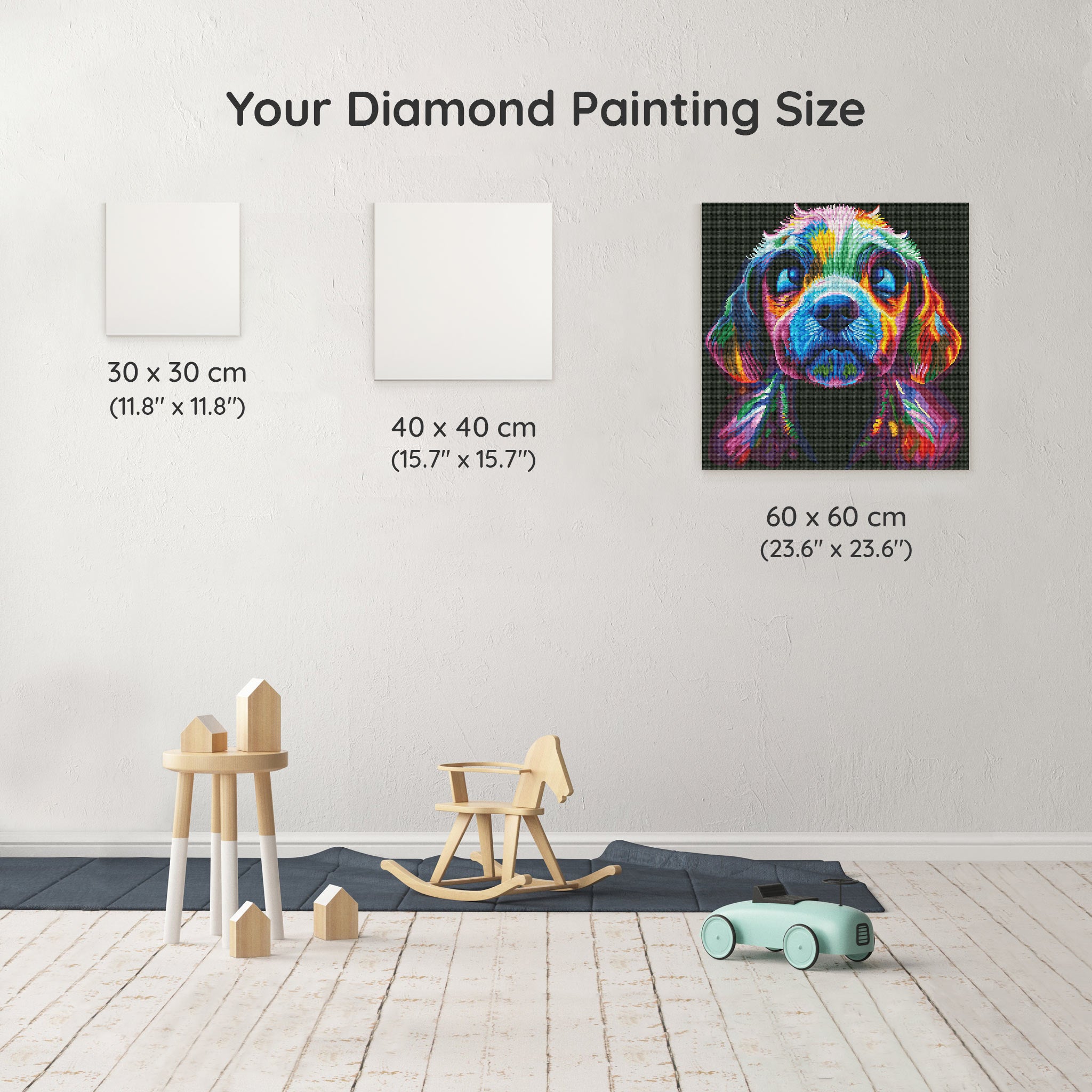Our canvas dimensions are approximate and may vary by 1–3 cm due to manufacturing processes. This slight variation does not impact the quality or completeness of your diamond painting project.